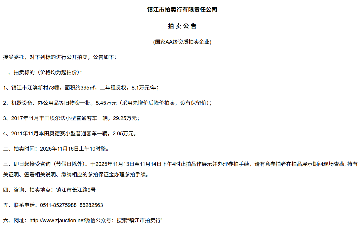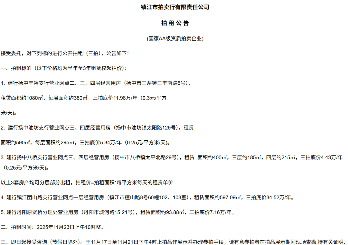鎮江市拍賣行有限責任公司拍 租 公 吿(國家AA級資質拍賣企業)接受委托,對下列標的進行公開拍租(三拍),公告如下:—、拍租標的(以下價格均為半年至3年租賃權起拍價):1.  建行揚中豐裕支行營業網點二、三、四層經營用房(揚中市三茅鎮三豐南路5號),租賃面積約1080㎡,每層面積約360㎡,三拍底價11.98萬/年(0.3元/平方米/天)。2.  建行揚中油坊支行營業網點三、四層經營用房(揚中市油坊鎮太陽路129號),租賃面積約590㎡,每層面積約295㎡,三拍底價5.34萬/年(0.25元/平方米/天)。3. 建行揚中八橋支行營業網點三、四層經營用房(揚中市八橋鎮太平北路29號),租賃  面積約400㎡,三層約185㎡,四層約215㎡,三拍底價4.43萬/年(0.25元/平方米/天)。以上3套房產均可分層部分出租,拍租價=拍租面積*每平方米每天的租賃單價4. 建行鎮江團山路支行營業網點一層經營用房(鎮江市檀山路8號60幢102、103室),租賃面積約597.09㎡,三拍底價34.52萬/年。5. 建行丹陽原賢橋分理處營業用房(丹陽市城河路15-21號),租賃面積約93.88㎡,二拍底價7.16萬/年。二、拍租時間:2025年11月23日上午10時整。三、即日起接受咨詢(節假日除外)。于11月17日至11月21日下午4時止拍品作展示并辦理參拍手續,請有意參拍者在拍品展示期間現場查勘,持有關證明、簽署相關說明、繳納相應的參拍保證金辦理參拍手續。四、咨詢、拍租地點:鎮江市長江路9號五、聯系方式:0511-85275988   13655299933楊先生六、網址:http://www_zjauction_net.to3ya.com;微信公眾號:搜索“鎮江市拍賣行” 拍品清單2025.11.23序號名稱起拍價(元)標的說明1建行揚中豐裕支行營業網點二、三、四層經營用房(揚中市三茅鎮三豐南路5號),租賃面積約1080㎡,每層面積約360㎡三拍底價11.98萬/年(0.3元/平方米/天)1、1-3號房產均可分層部分出租,拍租價=拍租面積*每平方米每天的租賃單價;2、意向競拍人在拍賣前需持營業執照或身份證與委托方說明租賃房產經營業態,確定意向后出具房產承租用途承諾書,經委托方審核后,方可交納保證金參加競拍;3、租賃期限為半年至3年(承租方與出租方協商而定),承租方每半年或一年結付租金,租賃期間的水、電費用及其它相關費用均由承租方承擔;4、承租方不得用于經營和保管危險物品,不得用于開設餐飲、娛樂等可能嚴重影響消防安全、運營安全的經營業態,不得用于經營委托貸款、小額貸款等可能冒用委托方名義,帶來聲譽風險的經營業態。租賃期內,承租方不得破壞墻體結構,自行成就消防、安全等使用條件,不得擅自將租賃房屋轉租、轉讓給他人使用,否則委托方有權收回房屋;5、拍租成交后,承租方將租金交至出租方指定賬戶,傭金交至拍賣方賬戶(拍租傭金為該房屋一個月租金)。承租方憑租賃合同無息退還保證金。2建行揚中油坊支行營業網點三、四層經營用房(揚中市油坊鎮太陽路129號),租賃面積約590㎡,每層面積約295㎡三拍底價5.34萬/年(0.25元/平方米/天)3建行揚中八橋支行營業網點三、四層經營用房(揚中市八橋鎮太平北路29號),租賃面積約490㎡,每層面積約245㎡三拍底價4.43萬/年(0.25元/平方米/天)4建行鎮江團山路支行營業網點一層經營用房(鎮江市檀山路8號60幢102、103室),建筑面積約597.09㎡三拍底價34.52萬/年5建行丹陽原賢橋分理處營業用房(丹陽市城河路15-21號),建筑面積約93.88㎡二拍底價7.16萬/年